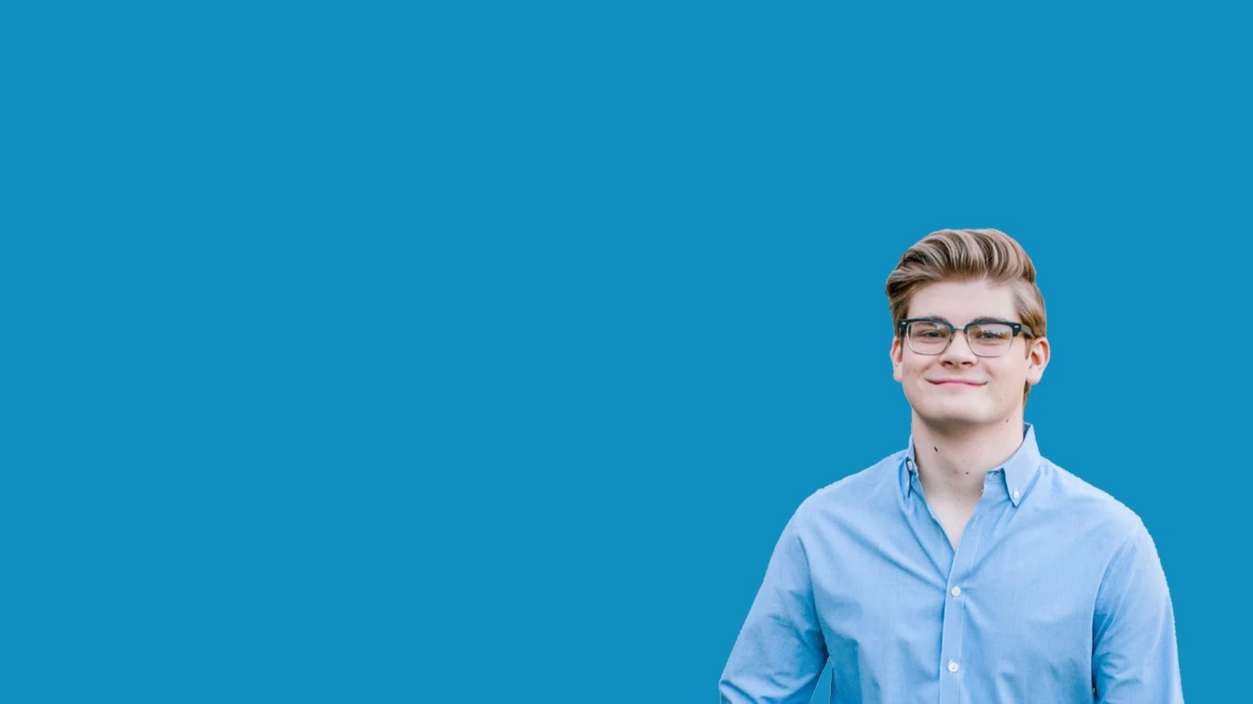 • Young Caucasian male with glasses in a blue collared shirt smiling at the viewer.